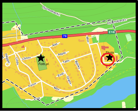 På bilden till vänster är Djurmo skolans gymnastiksal inringad och de svarta stjärnorna visar tillgängliga parkeringar.